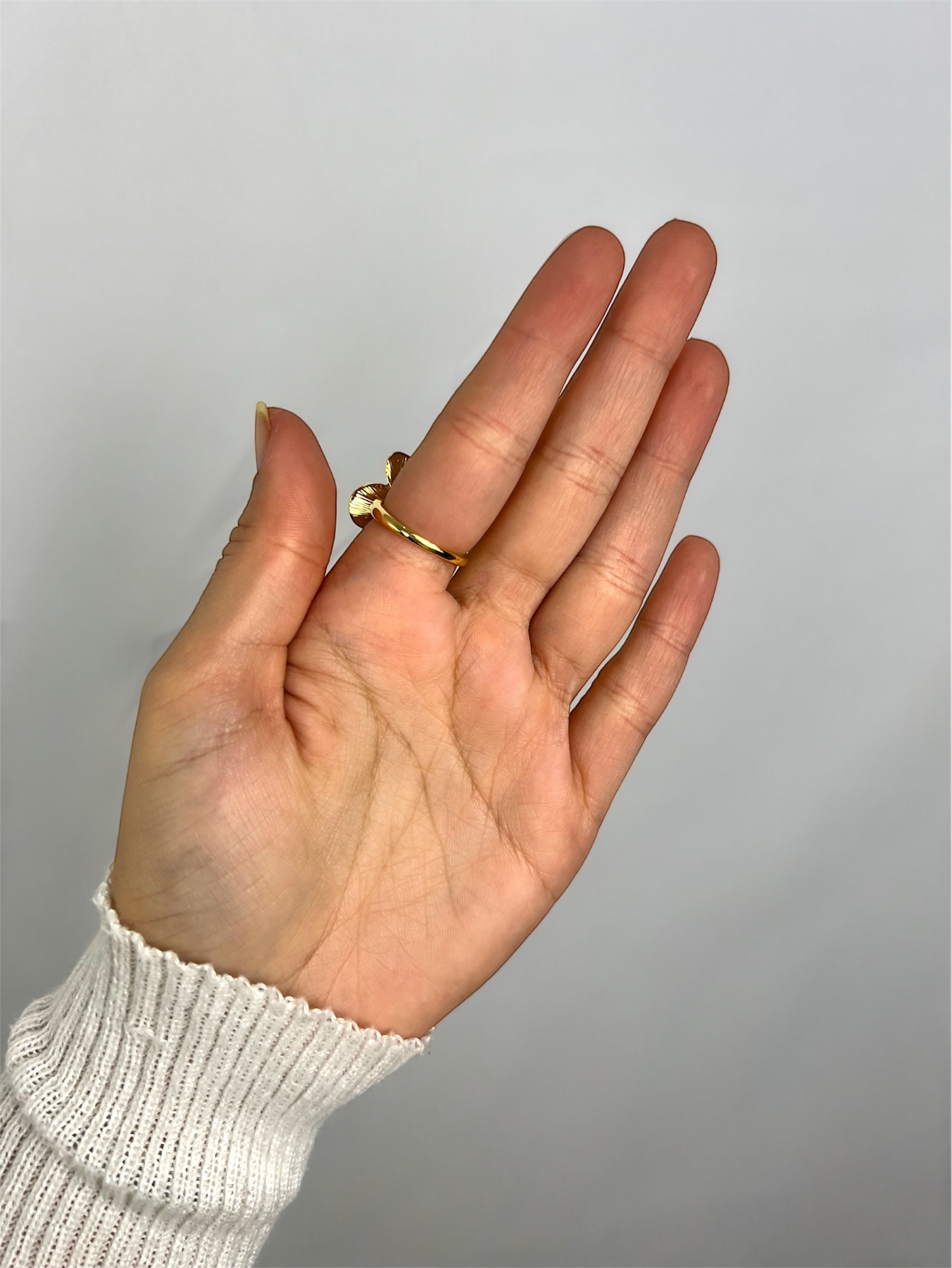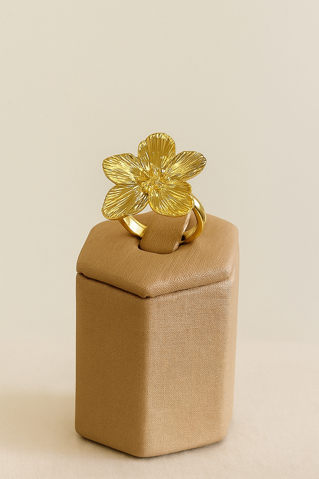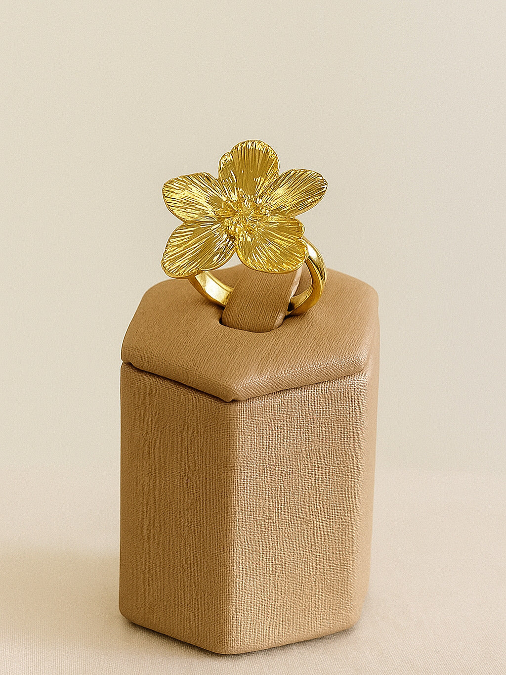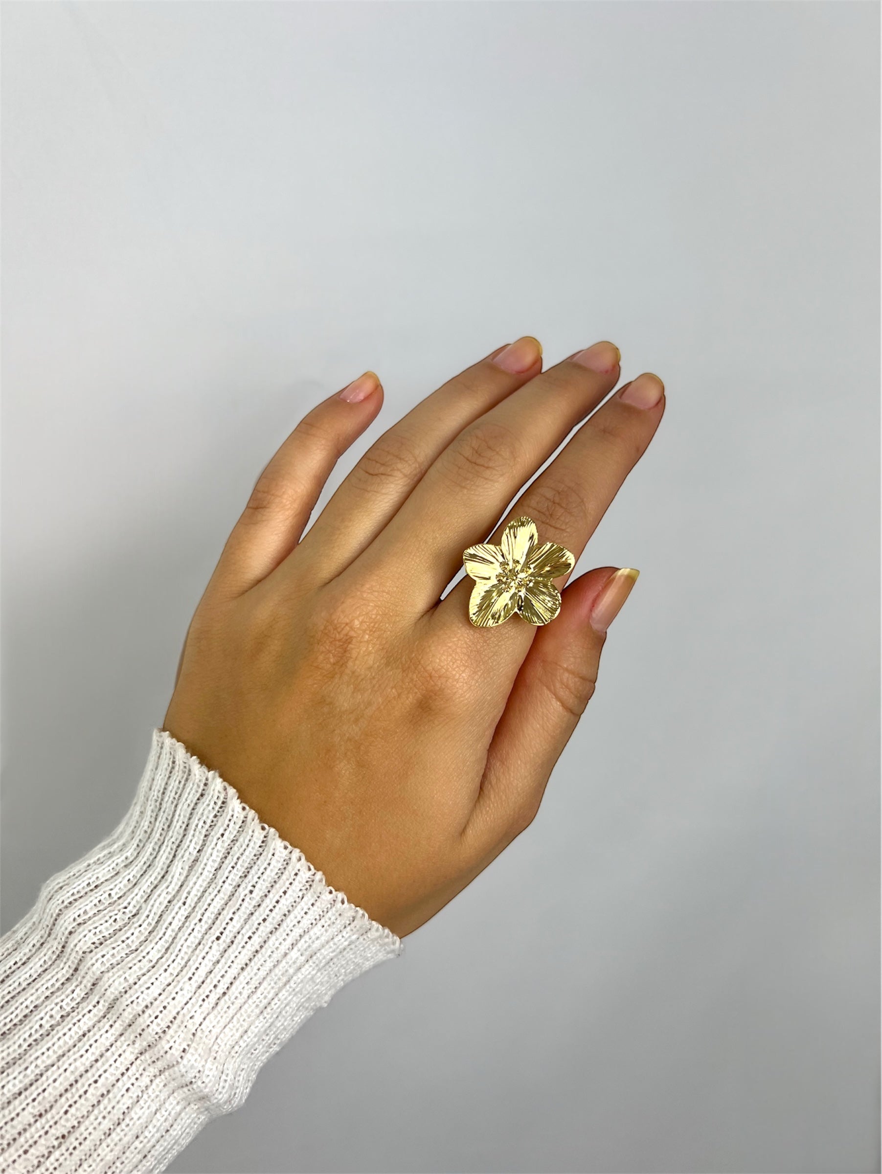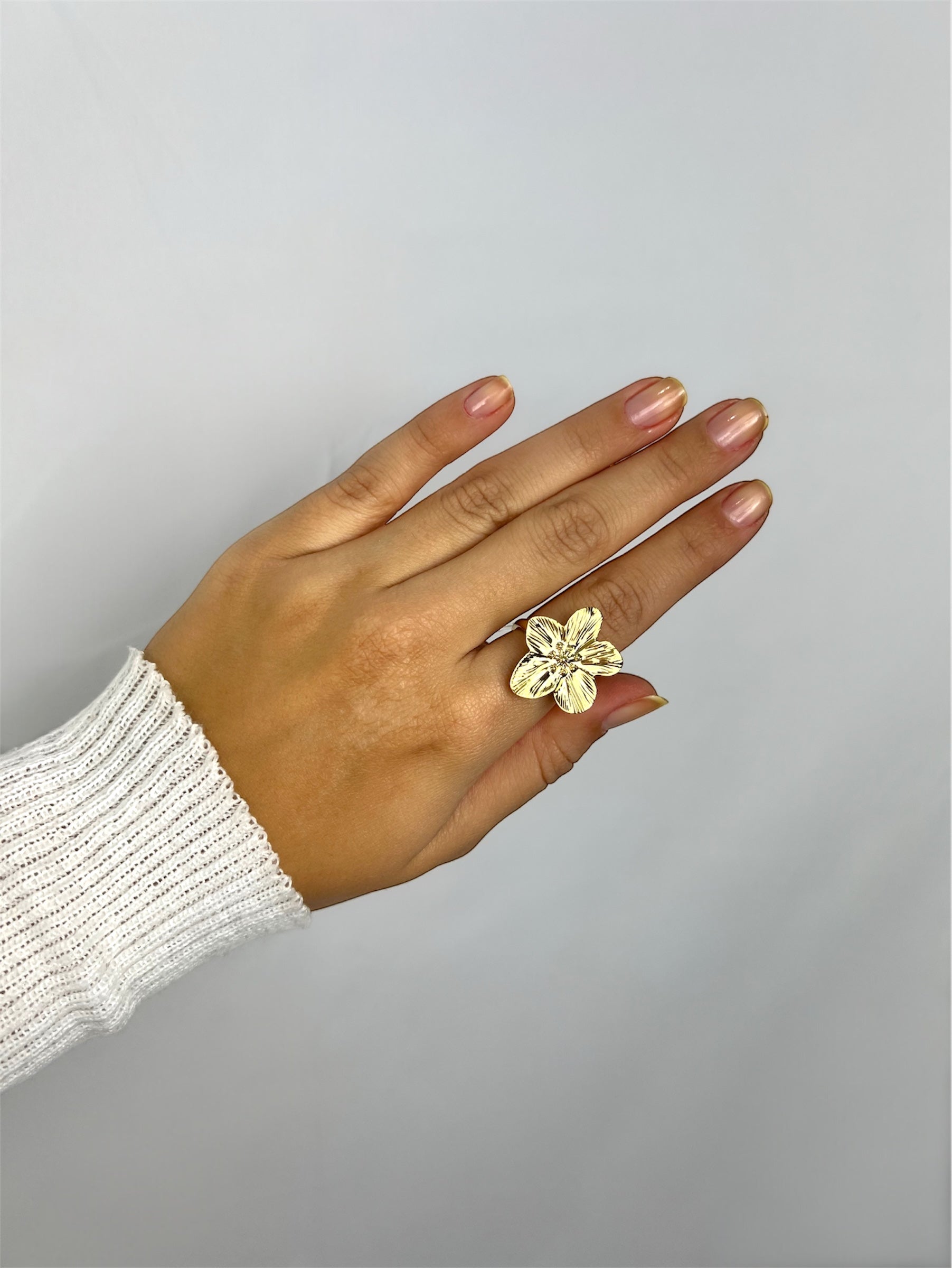 Anel dourado com design de flor orgânica, que combina delicadeza e modernidade em uma peça única. Seu formato martelado, fluido e elegante traz um toque natural e sofisticado ao visual.