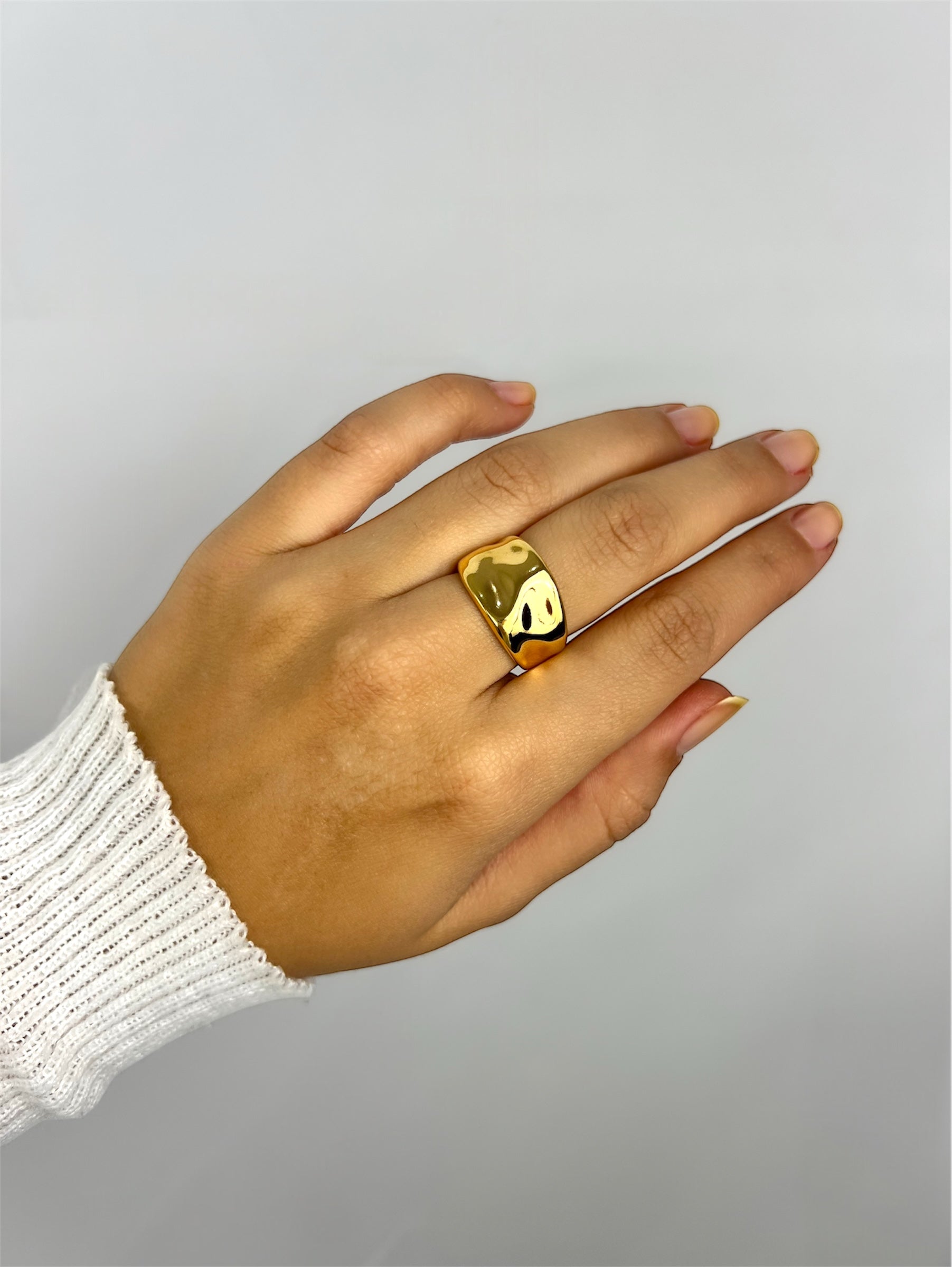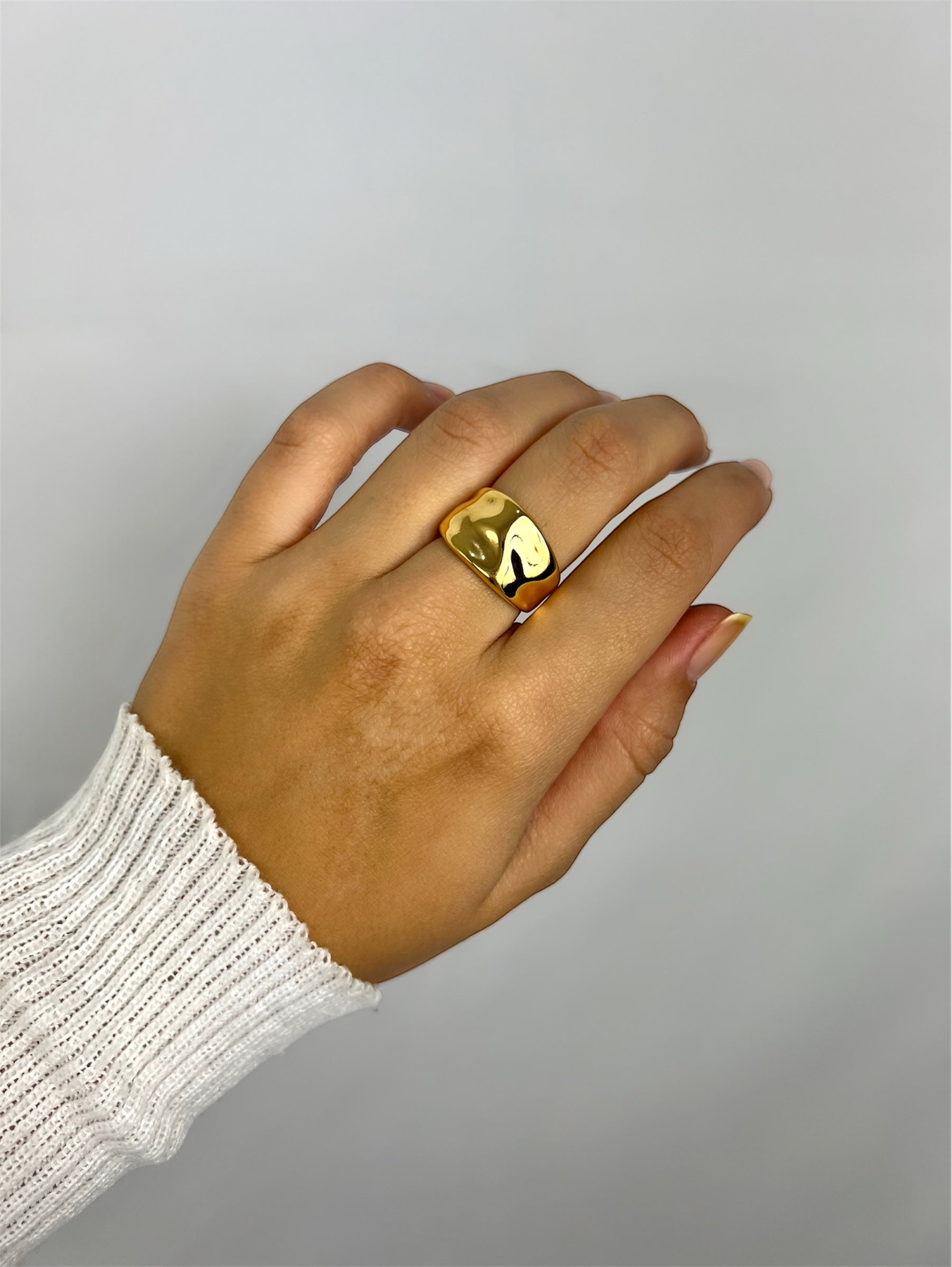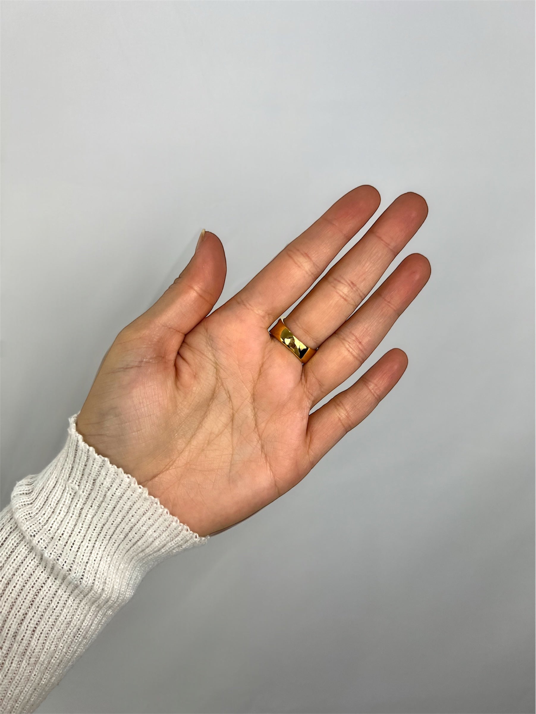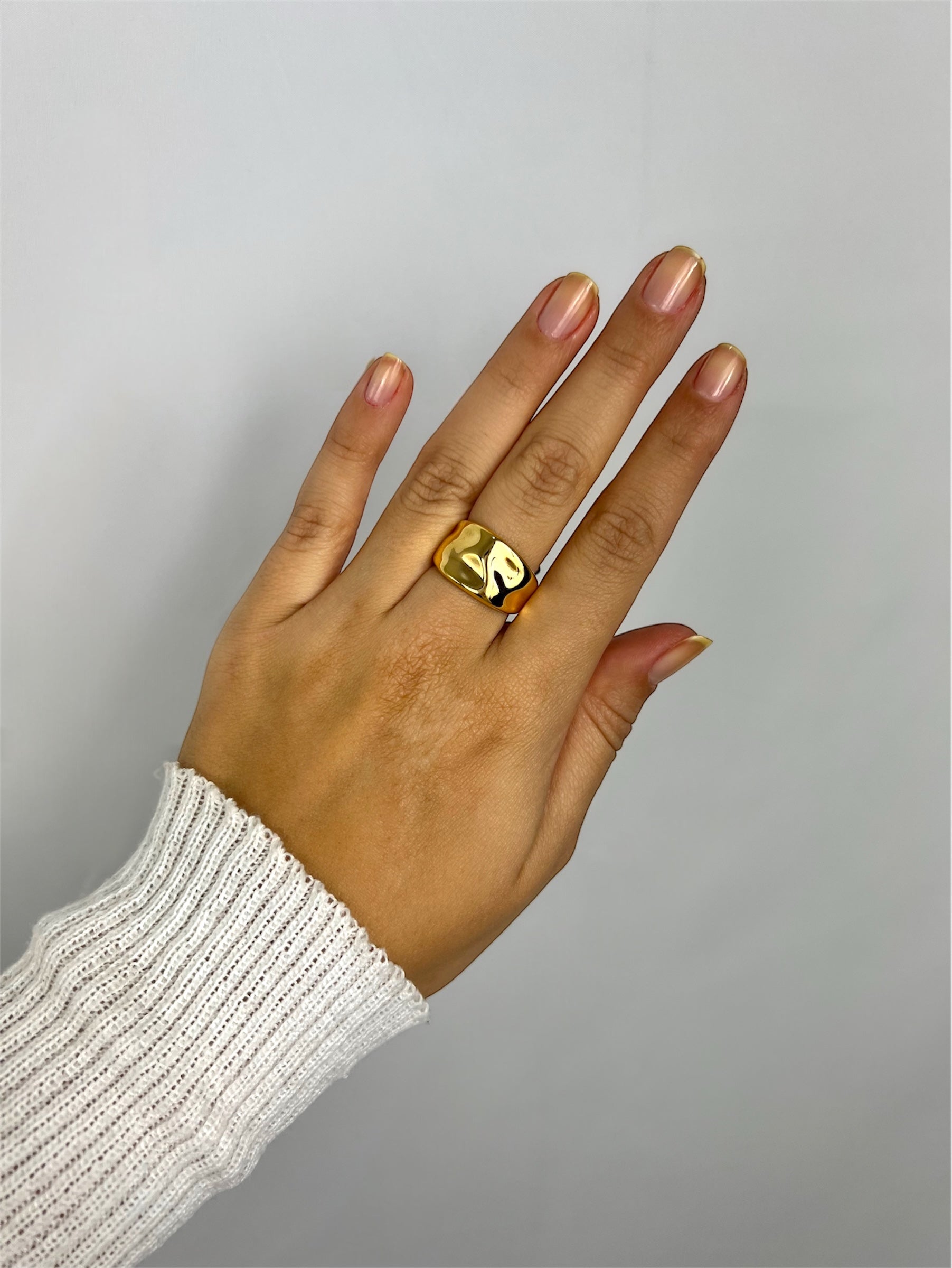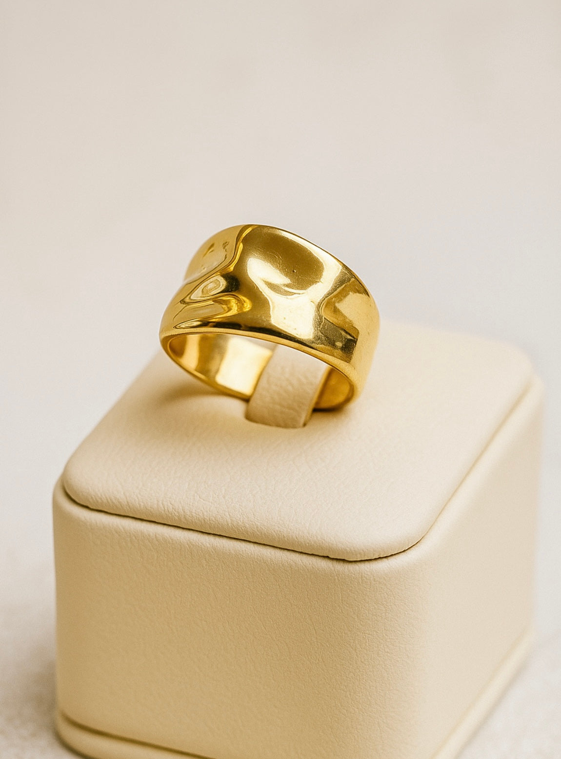 Anel semijoia largo com acabamento martelado liso, que une textura e sofisticação em uma peça marcante. Perfeito para quem busca estilo e elegância em detalhes discretos.