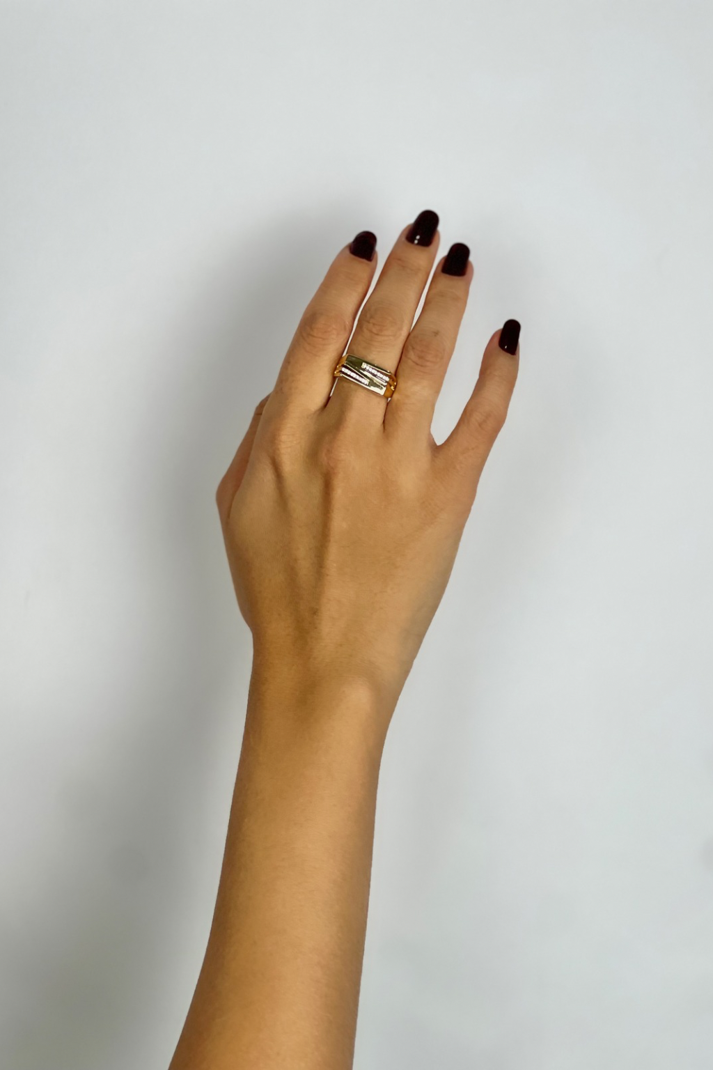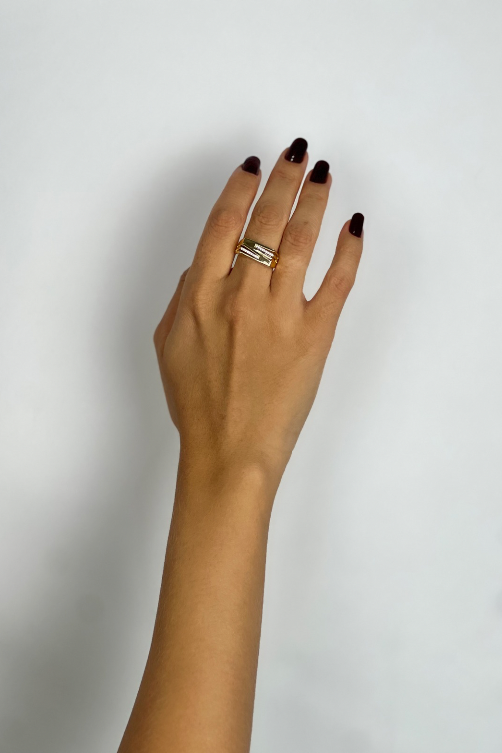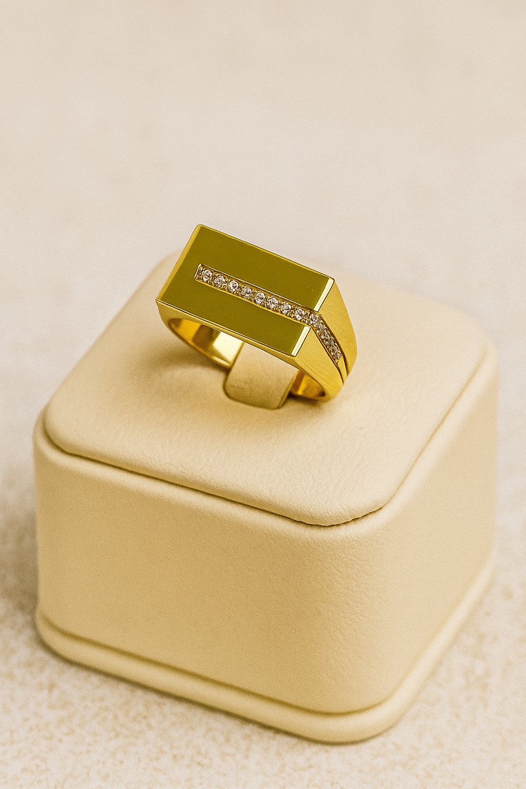 Anel semijoia retangular com modelo em “Z” cravejado com zircônia, unindo modernidade e brilho em uma peça sofisticada. Perfeito para quem quer adicionar personalidade e elegância aos detalhes do look.