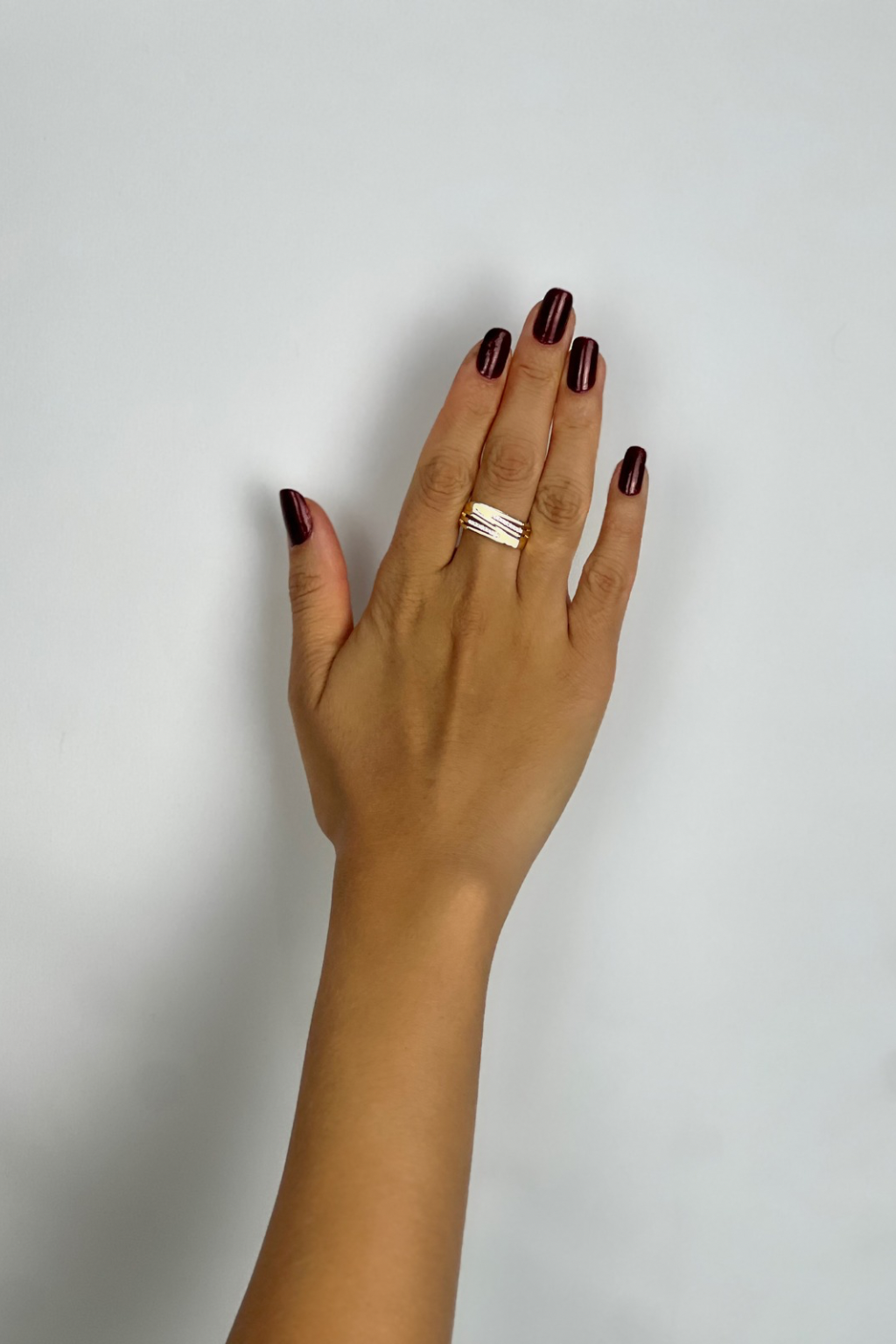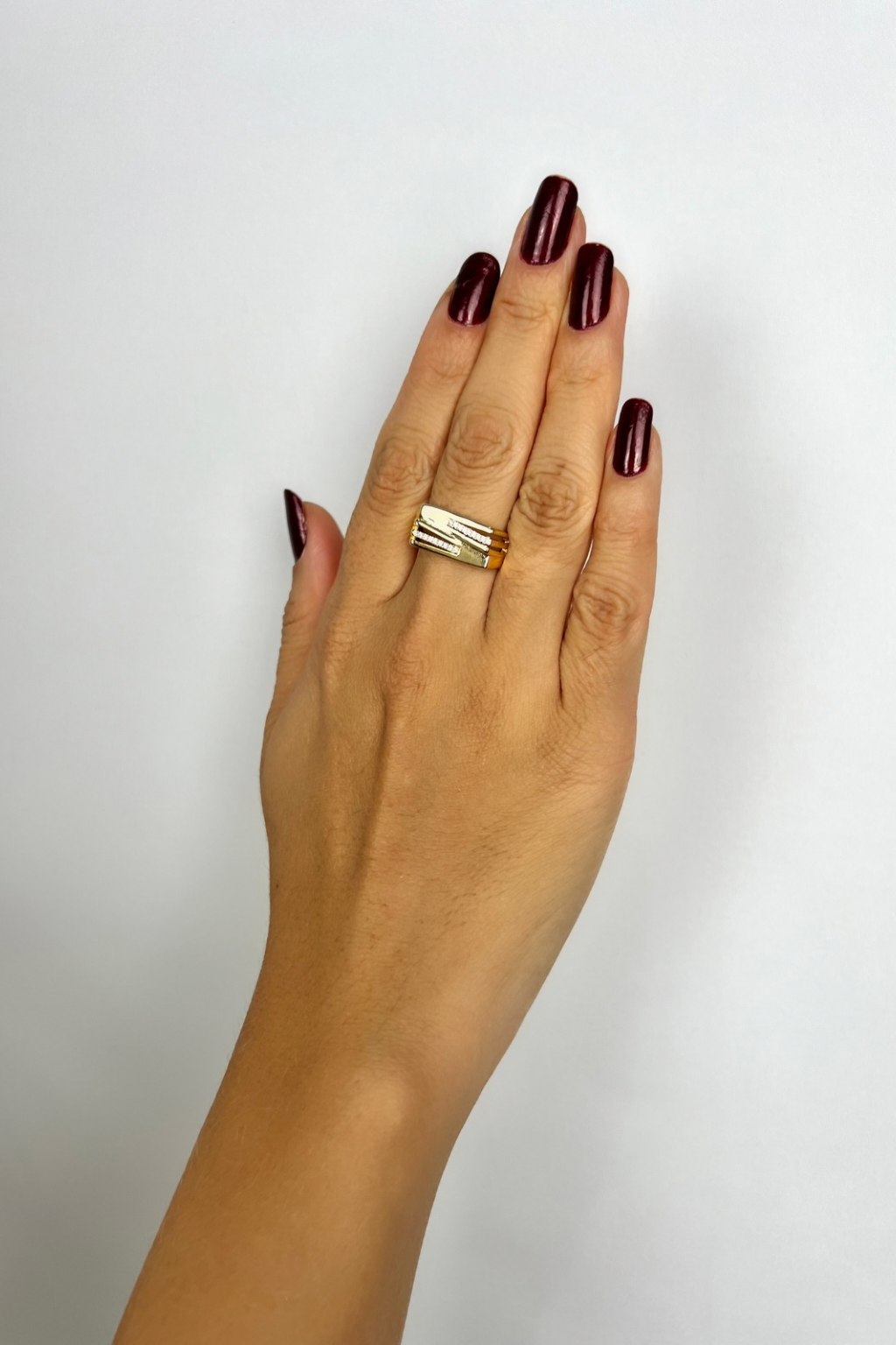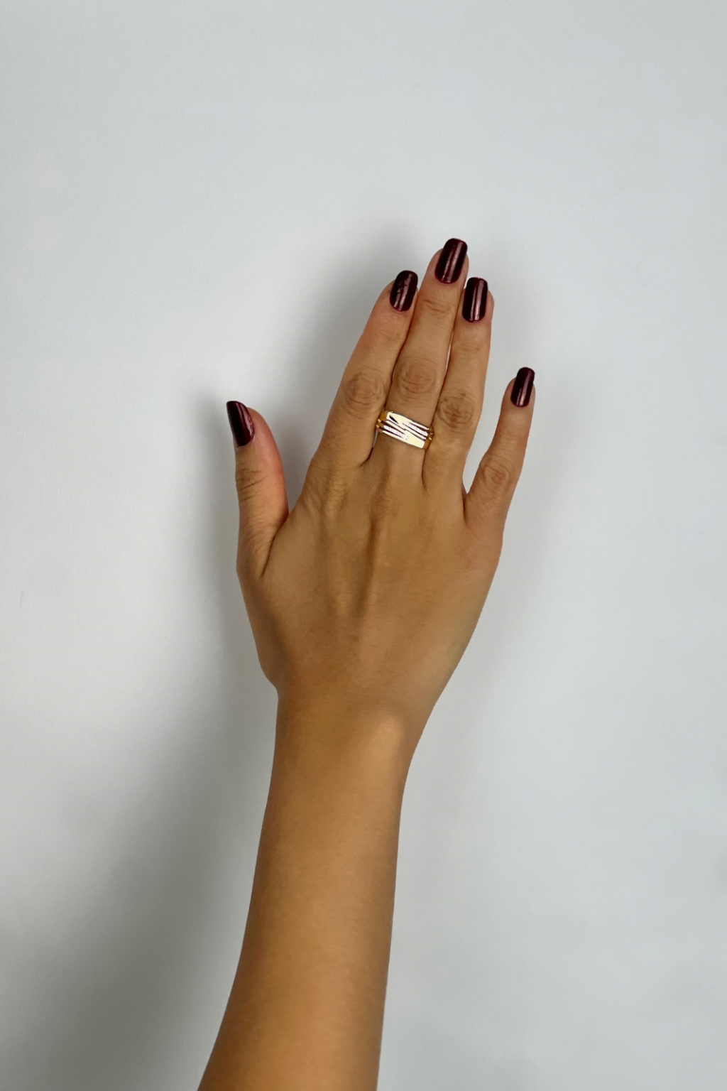Anel semijoia retangular com modelo em “Z” cravejado com zircônia, unindo modernidade e brilho em uma peça sofisticada. Perfeito para quem quer adicionar personalidade e elegância aos detalhes do look.