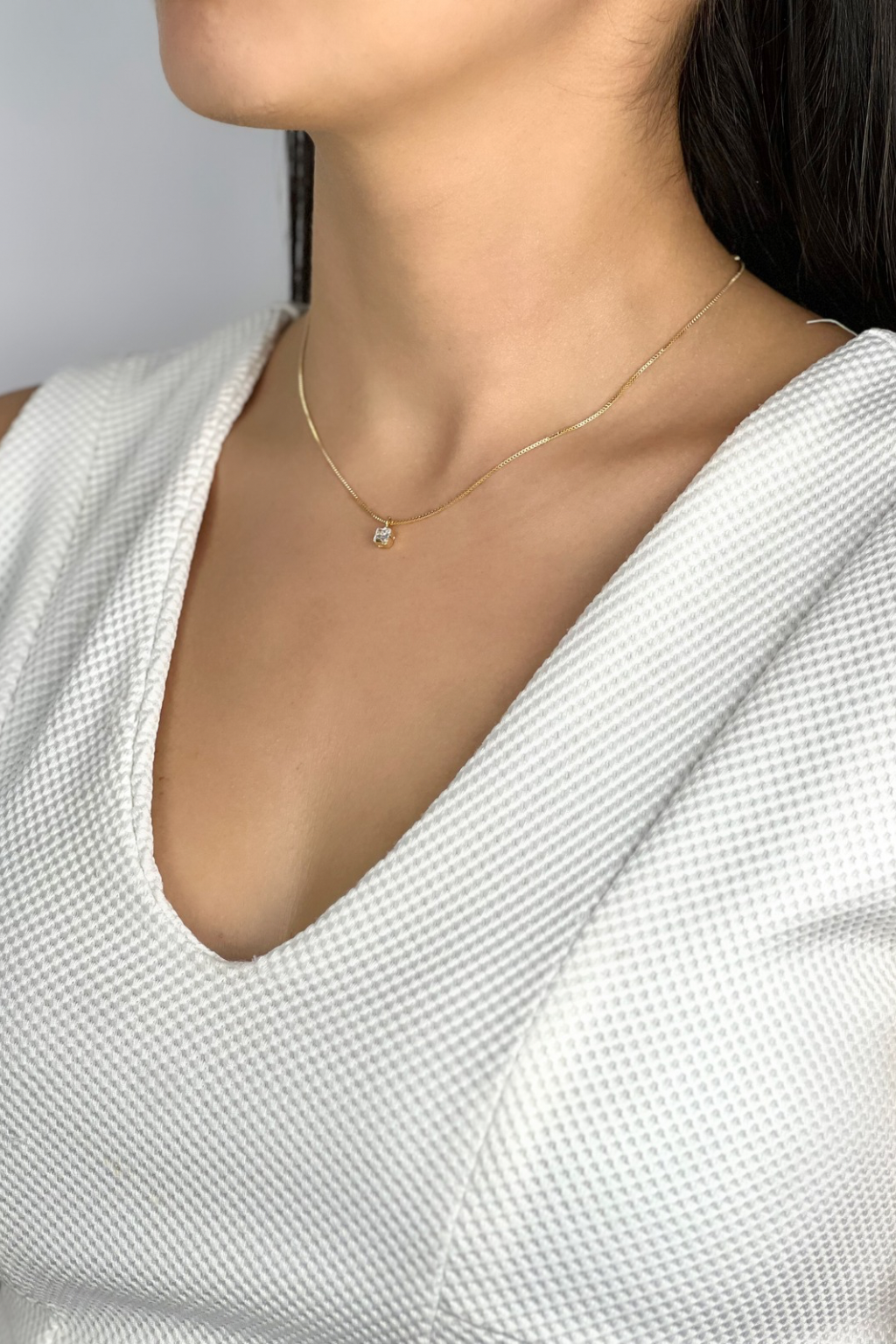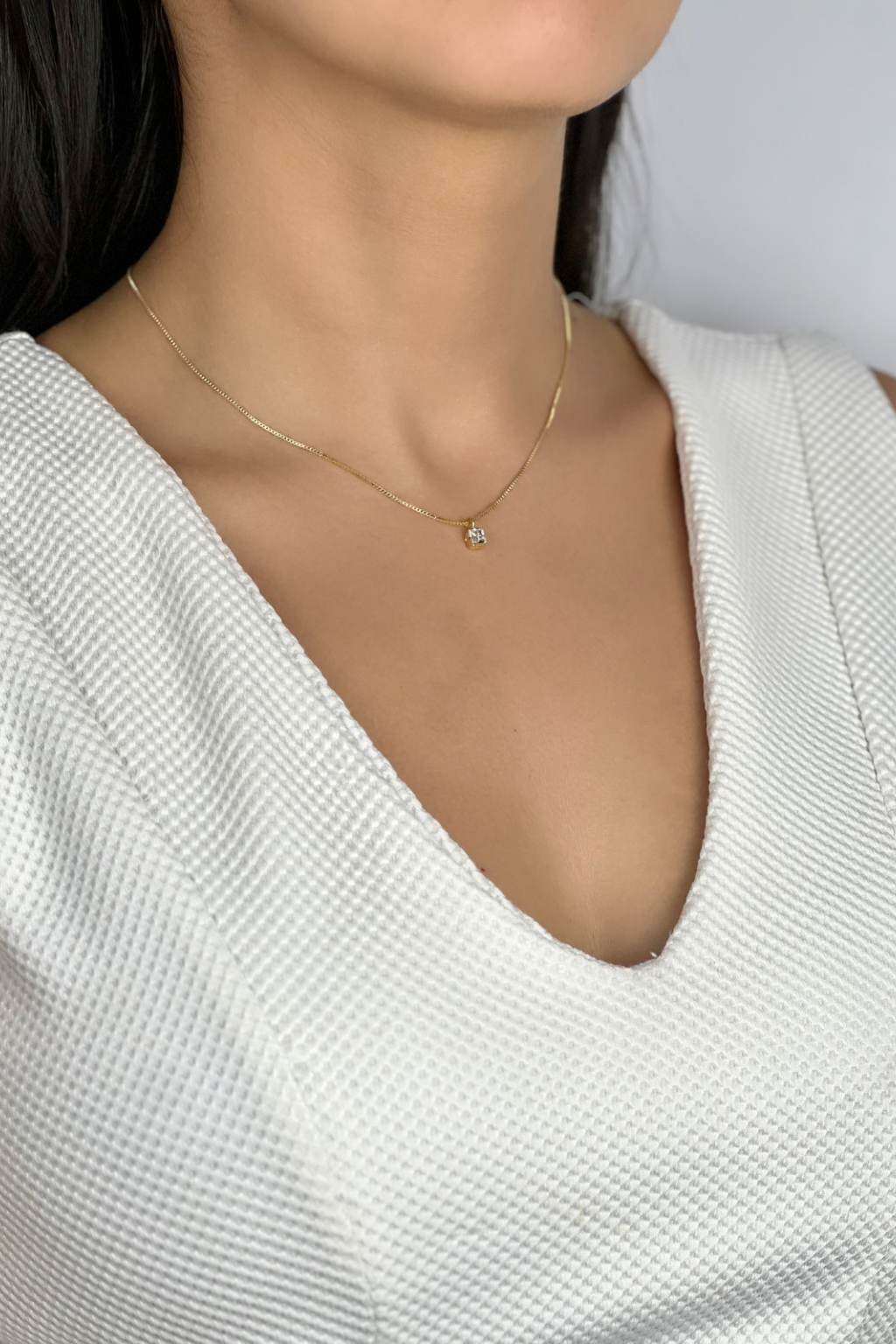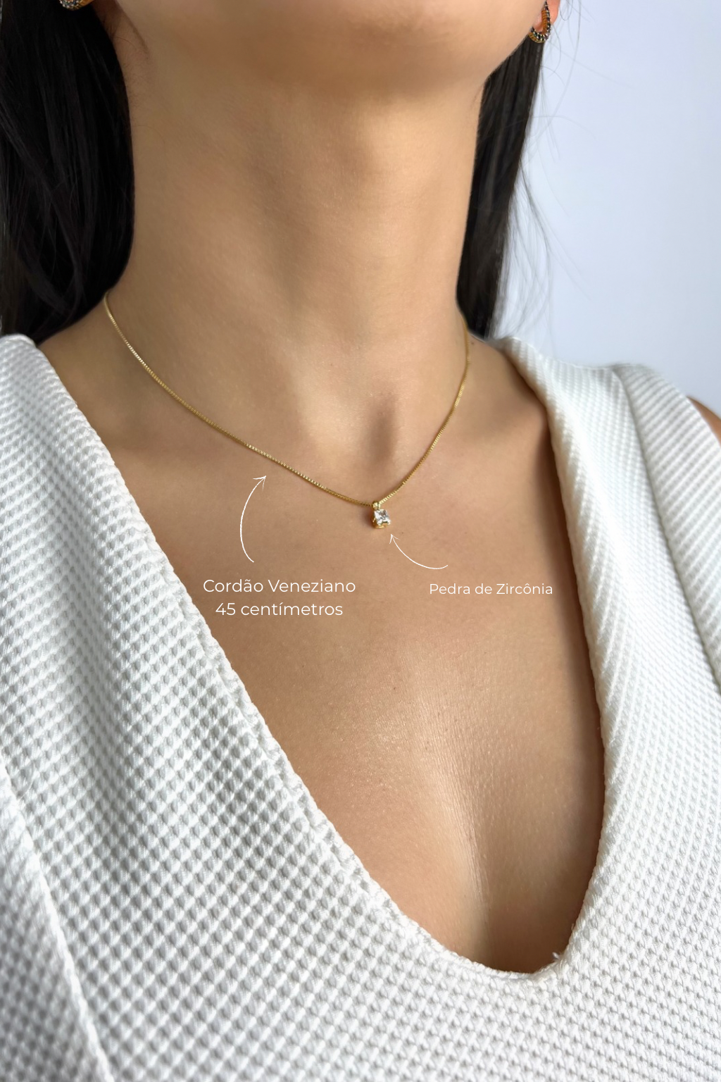 Colar com ponto de luz em formato quadrado com pedra de zircônia, moderno e elegante. Com 30 centímetros de comprimento, é a peça ideal para adicionar um toque de brilho sutil e sofisticado ao visual. O cordão possui extensor de 10 centímetros.