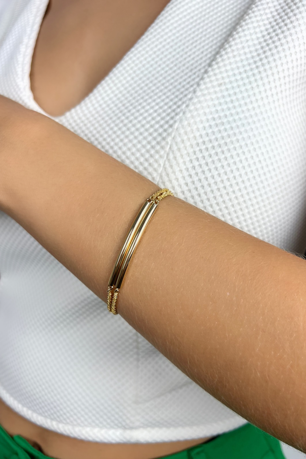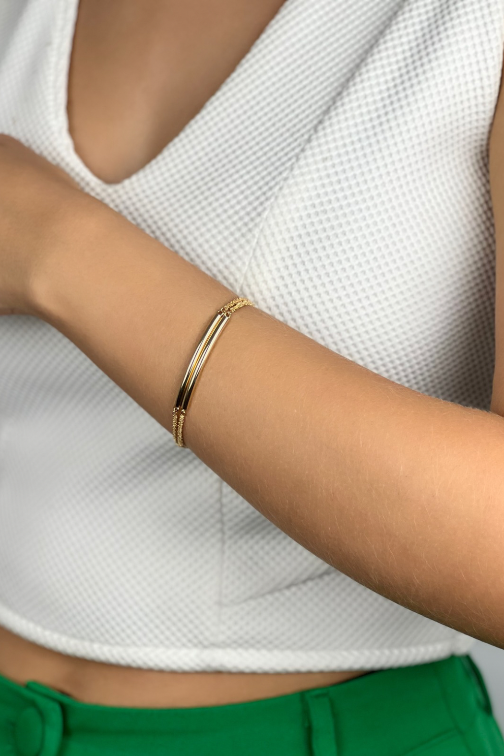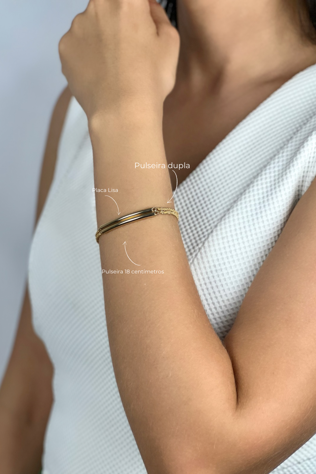 Pulseira Semijoia dupla com detalhes e dois tubos centrais, moderna e elegante. Com 18 centímetros de comprimento, combina design minimalista e brilho sutil, perfeita para compor looks sofisticados no dia a dia.