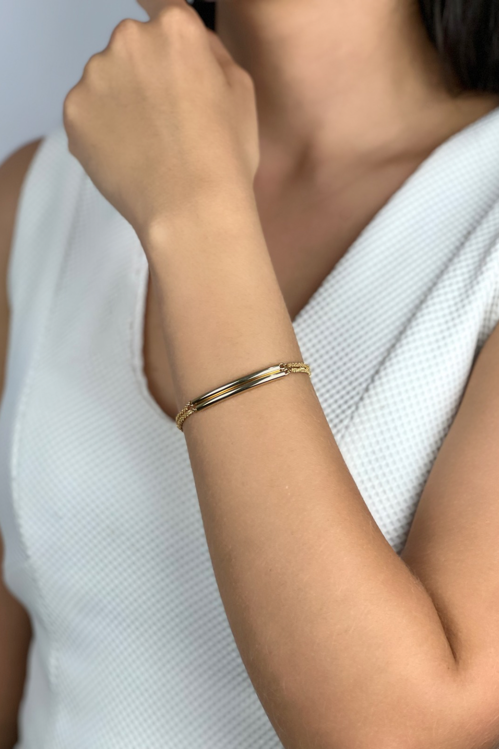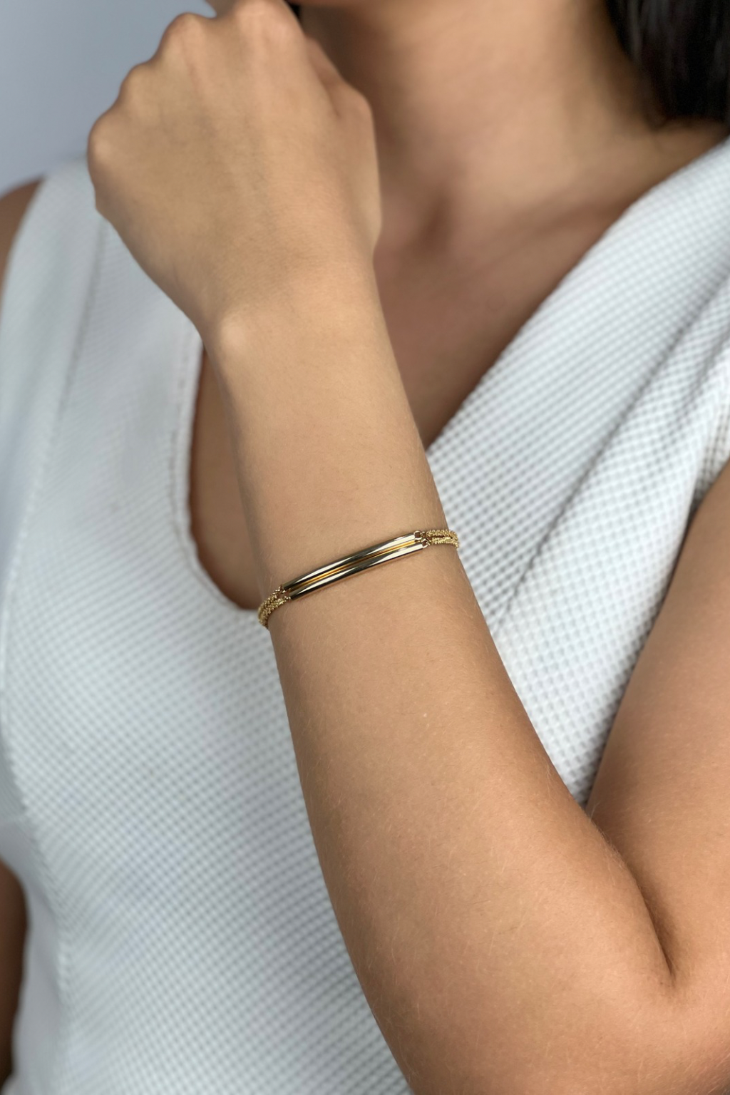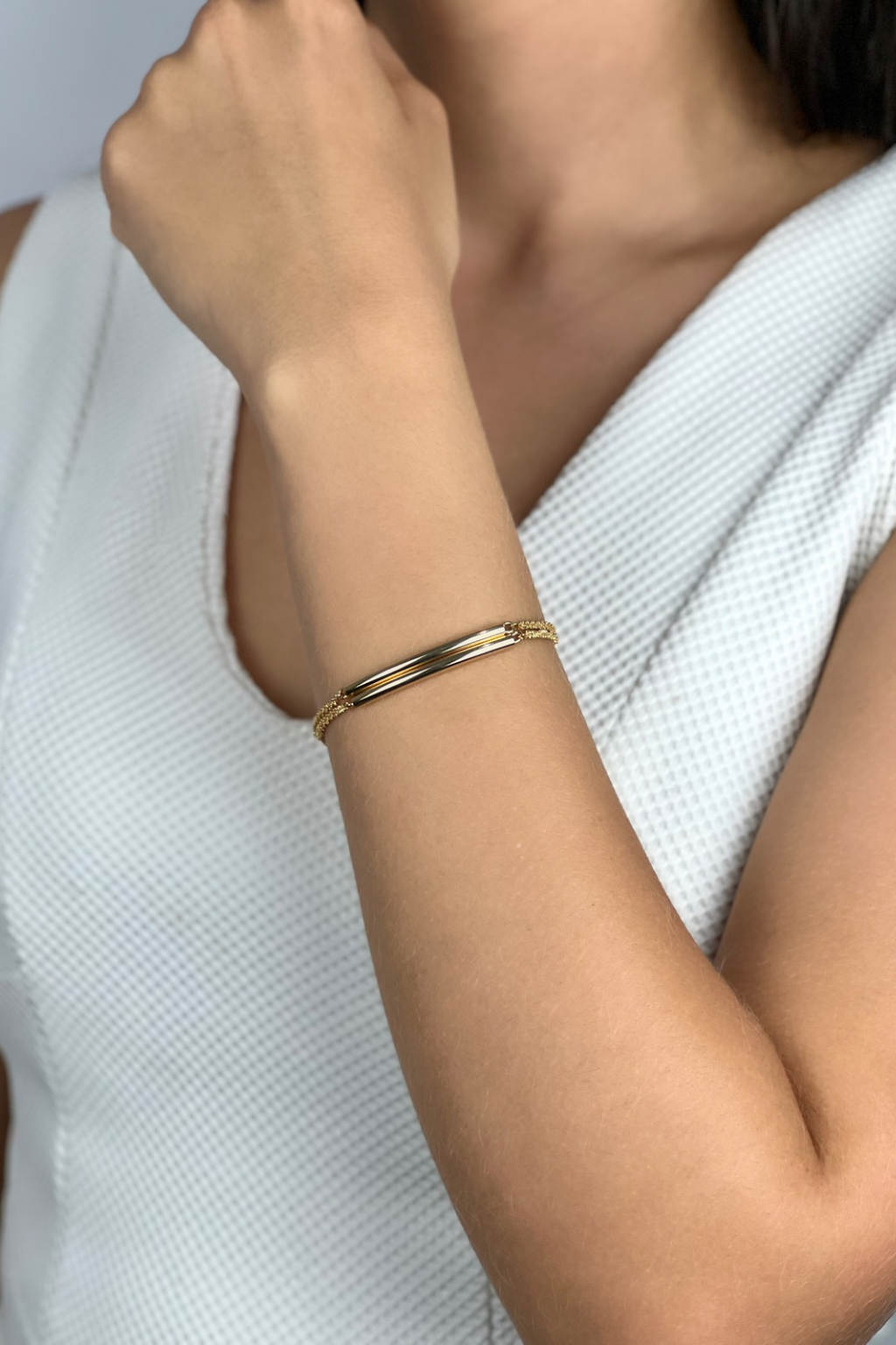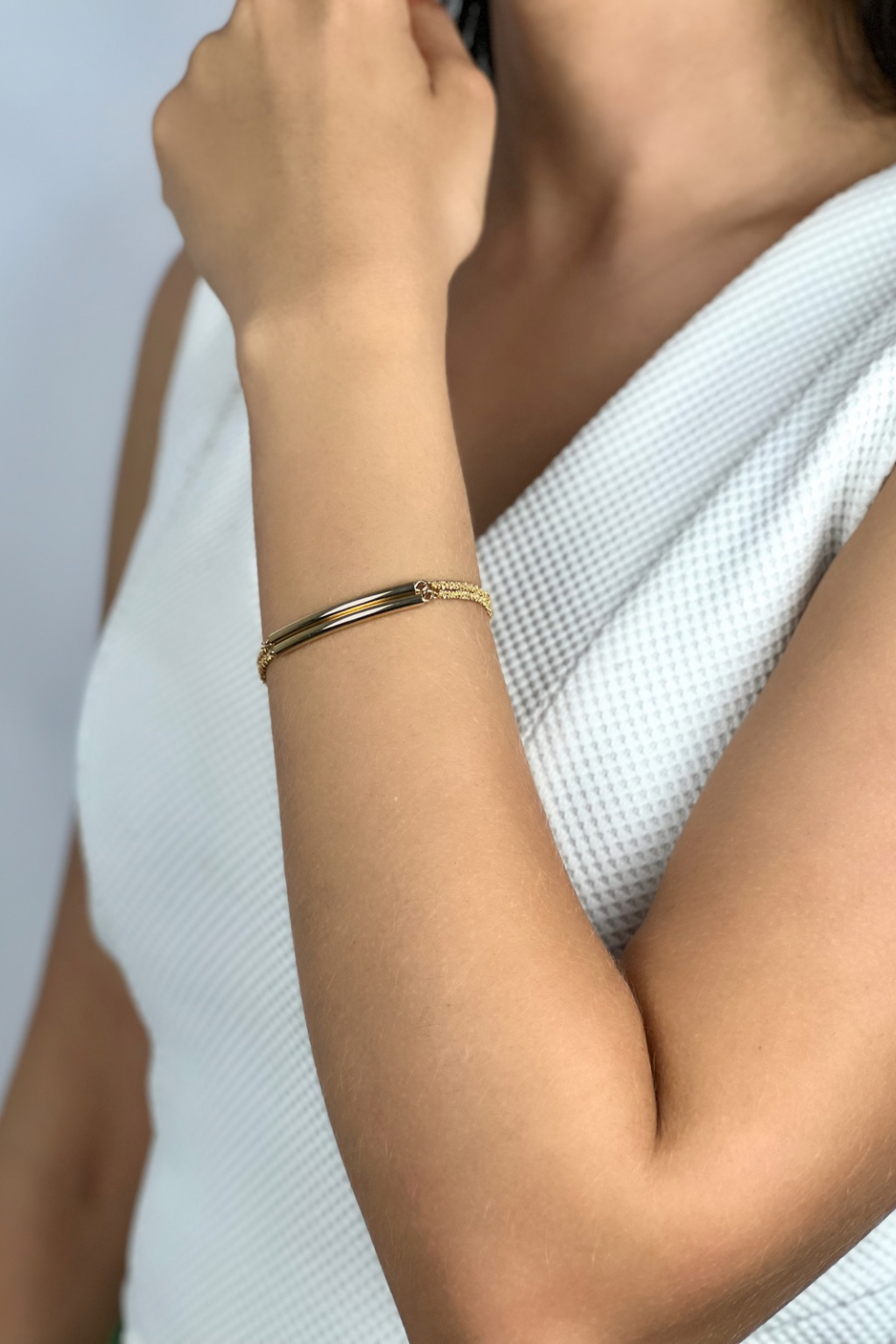 Pulseira Semijoia dupla com detalhes e dois tubos centrais, moderna e elegante. Com 18 centímetros de comprimento, combina design minimalista e brilho sutil, perfeita para compor looks sofisticados no dia a dia.